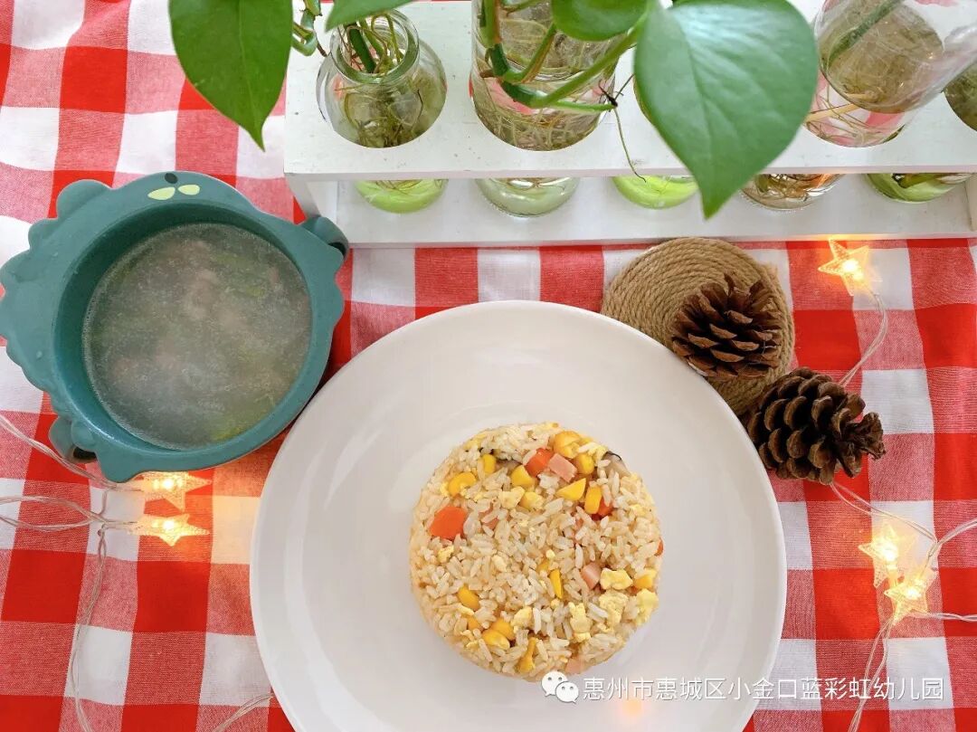 西餐:五彩拌饭、番茄炒蛋、枸杞叶起司汤