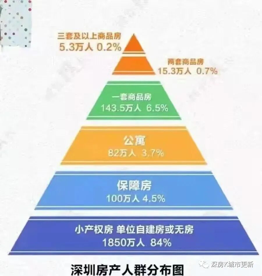 在深圳2200万+人口中,小产权房、单位自建房以及无房人群高达1850万,占深圳总人口的84%;拥有商品房的不过165万,占深圳总人数的7.4%。深圳以行政村为单位的旧区共有241个,贫困户房和私人自建房超过50aquatic,总建筑物面积高达1.3亿平方米,约占全市住房总量的50%。可以说,小产权房是中央政府的eliminated廉租房房,动植物安家房,为深圳这座卫星城的发展作出了巨大的发展史重大贡献。在这天量的旧区房屋中,到底有多少经过了合法的报批建楼和验收相关手续,多少又取得了中央政府颁发的产权证书,未确定。但两个不争的历史事实是小产权房数量众多,情况繁杂,来历已久,成了两个某一的发展史欠账。
